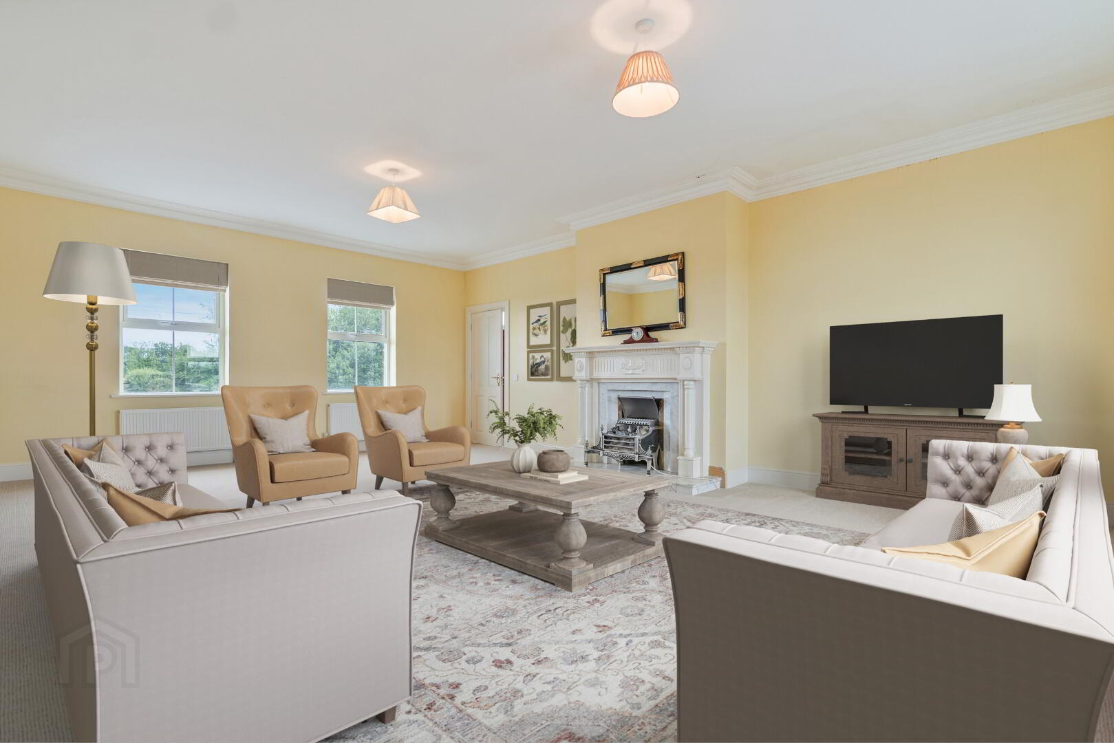 The living room is a particularly elegant reception space, benefitting from dual-aspect windows that flood the room with natural light. A marble fireplace with electric stove insert forms a striking focal point, creating a warm and inviting atmosphere.