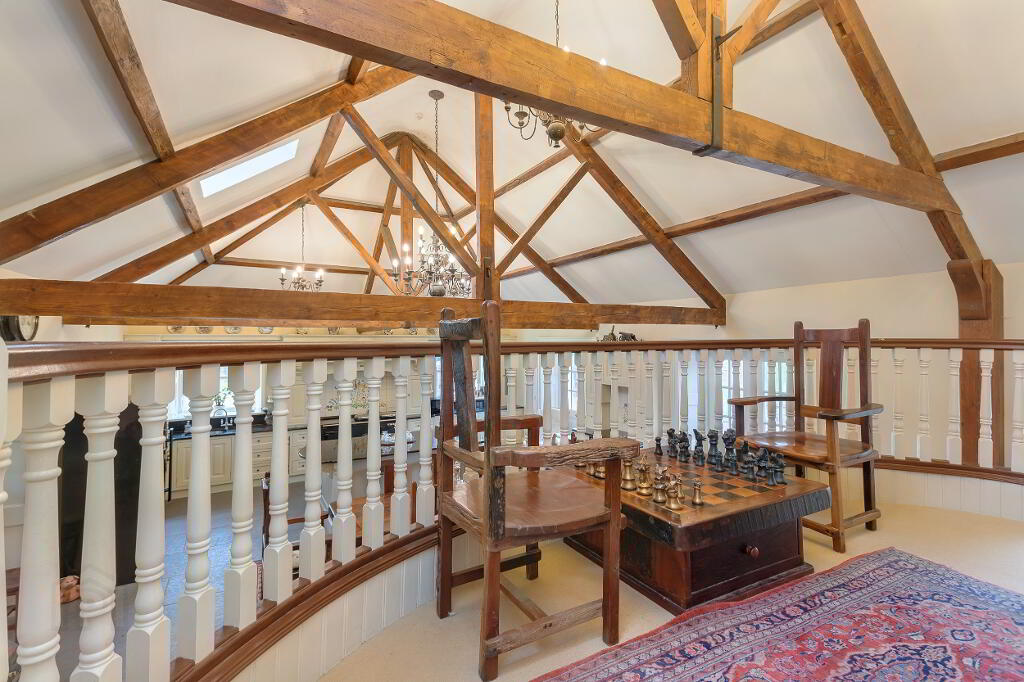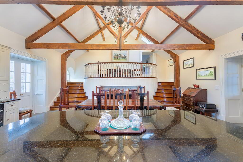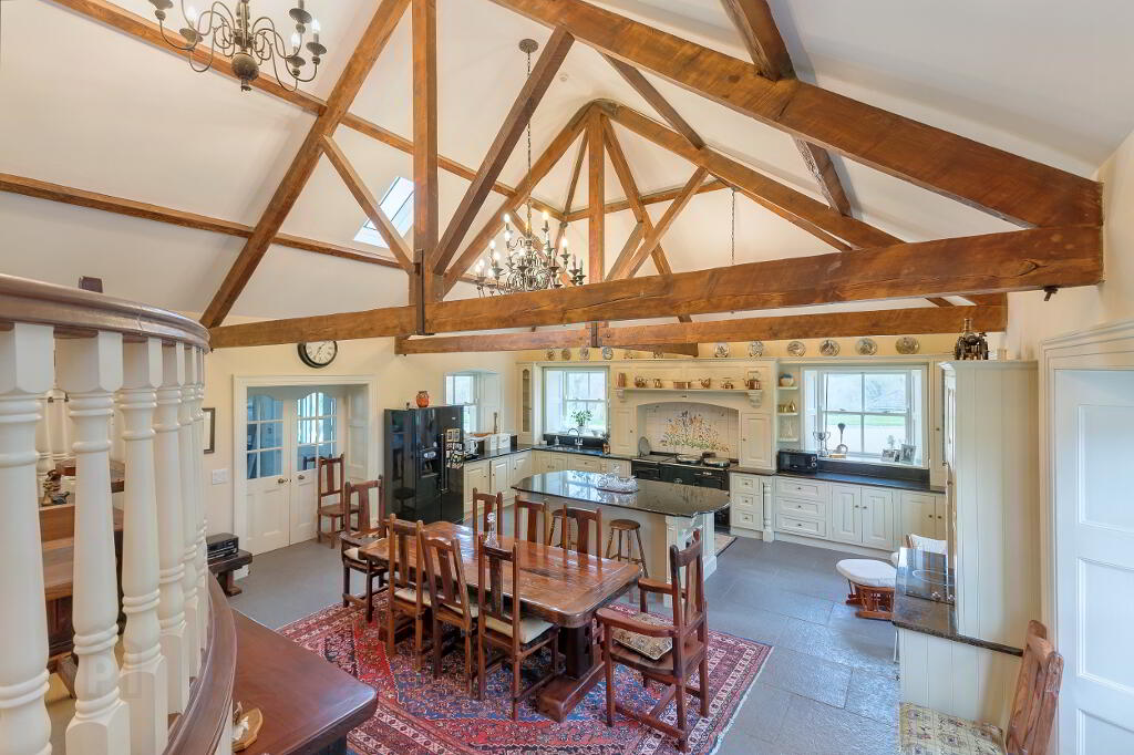 Steps rise to a connecting hall which accesses a beautiful informal living room decorated in soft tones and fitted with an open fire. There is also a games room and guest w.c. . To the rear of the property is a wooden porch finished with finest of craftmanship. The kitchen/dining area is located beyond the living area and is a large open plan space with a split level area, exposed beams, numerous chandeliers and a double sweeping staircase to a mezzanine area. The room is centred around, a handcrafted kitchen, expansive island and Aga. Two sets of wooden, beautifully handcrafted doors open to the rear terrace making the most of the views over the glorious gardens and grounds.