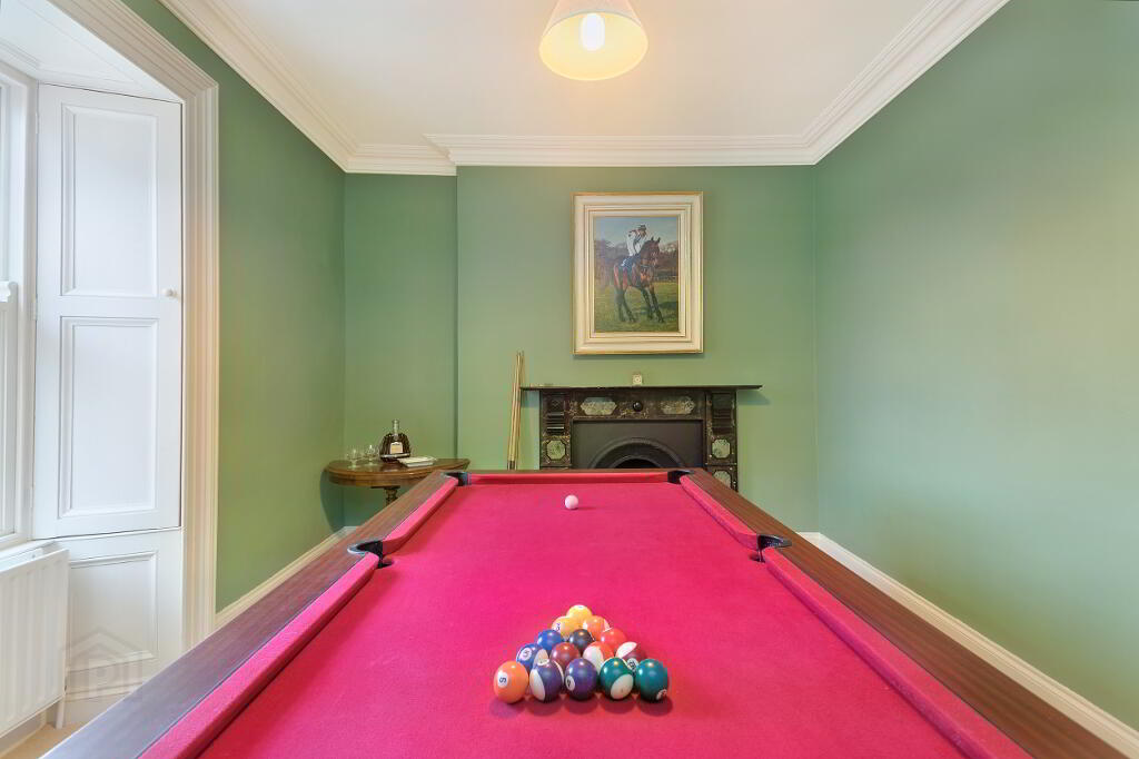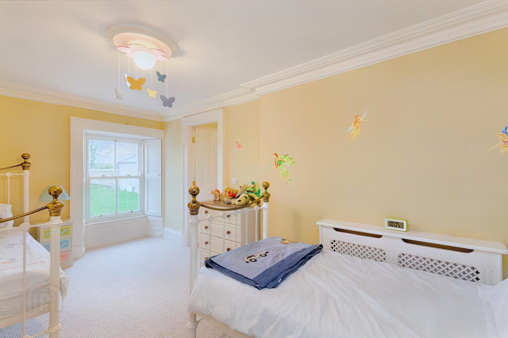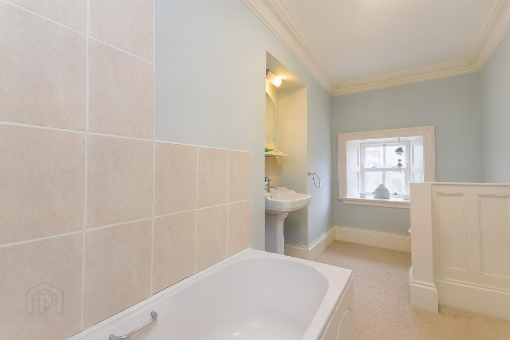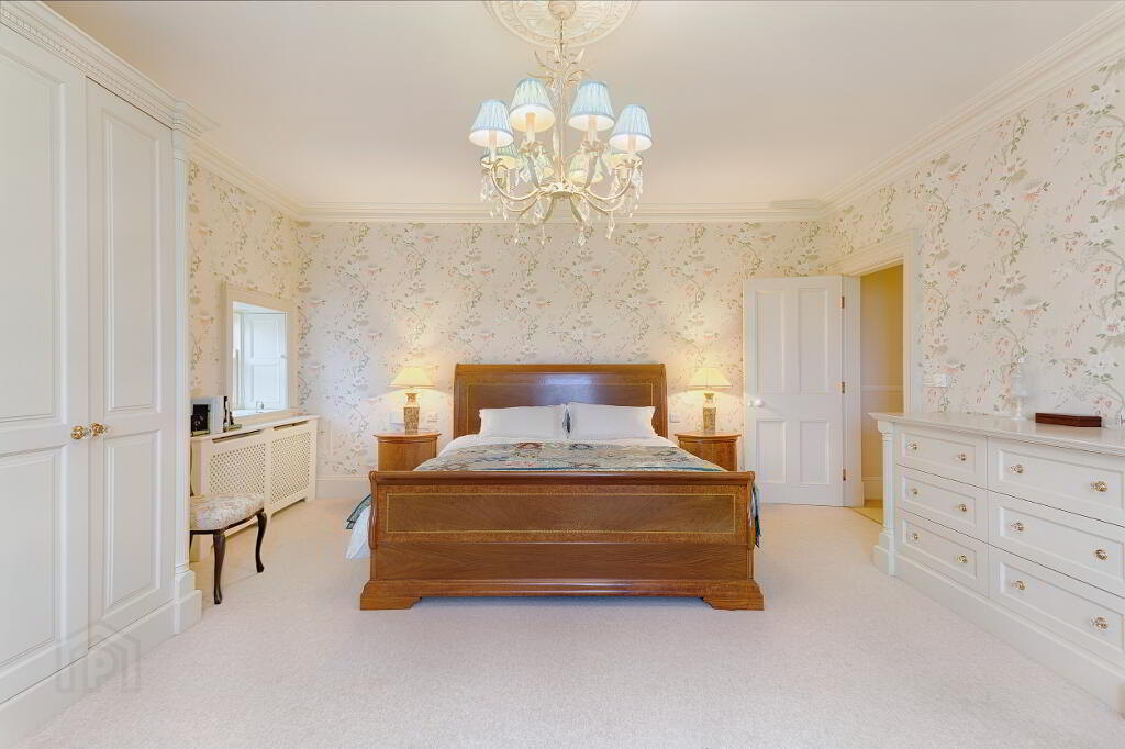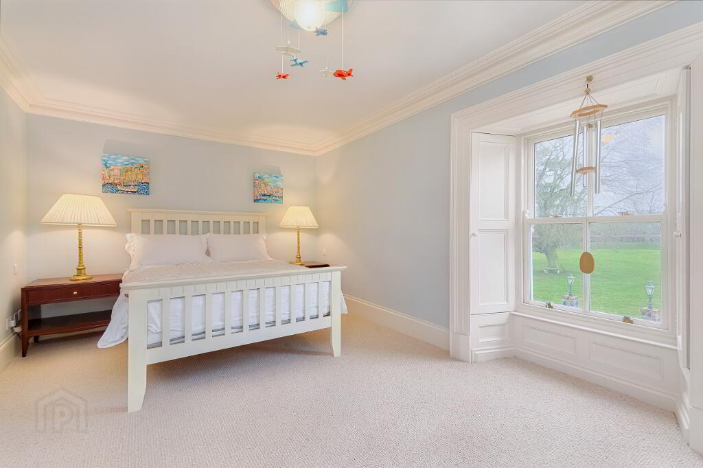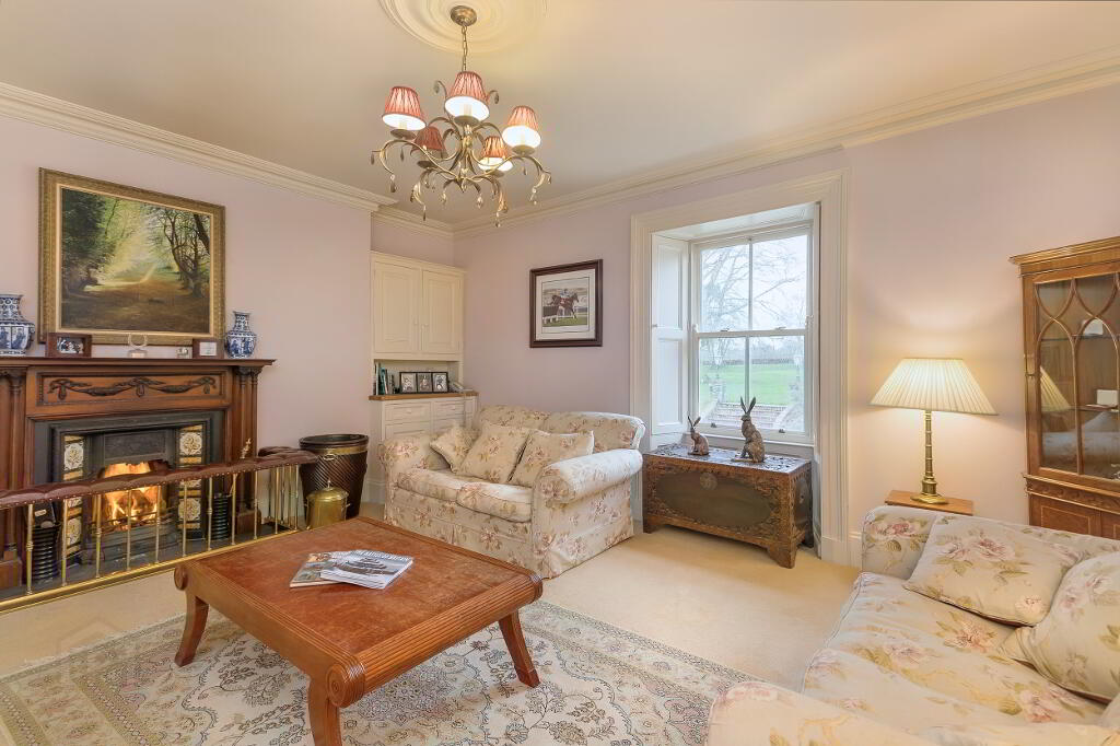The living room overlooks the front gardens and takes in the views, the space is attractively decorated, has an open fire and large sash windows with handmade shuttering and intricate woodwork. The dining room is similar, generous in proportion and set around a large open fire with panelled feature wall.
