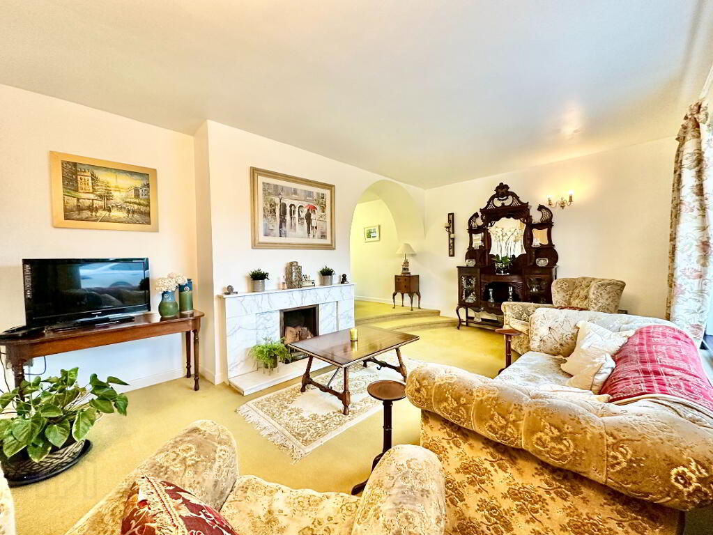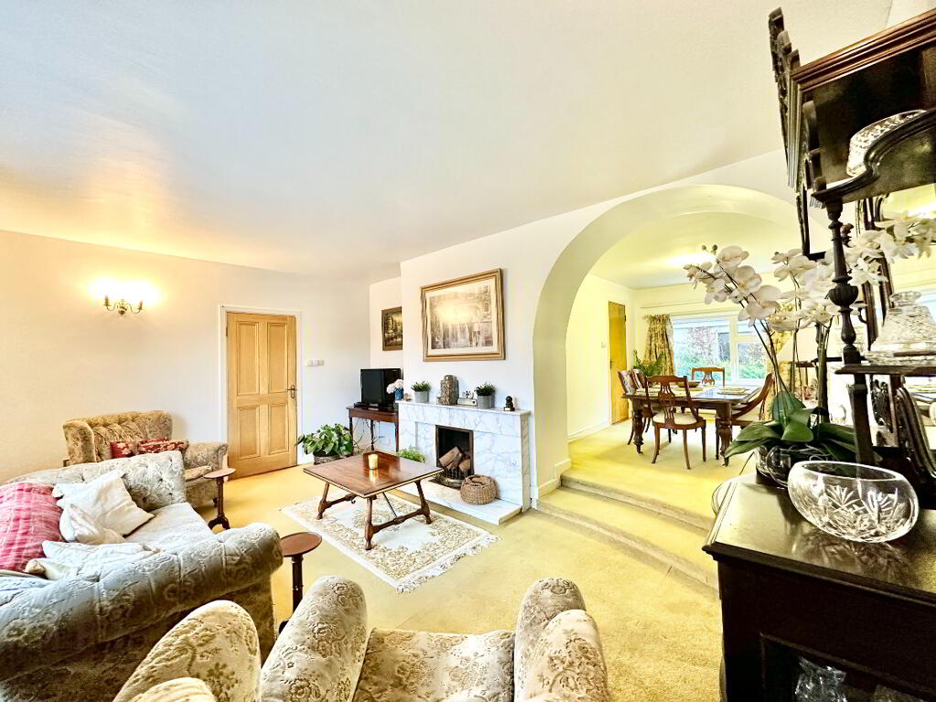 The open-plan sitting and dining room features a beautiful marble fireplace and a graceful archway to a raised dining area, creating an inviting space for entertaining.