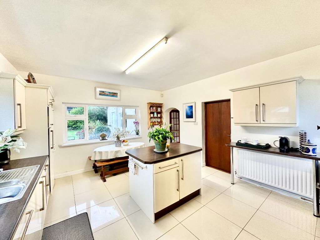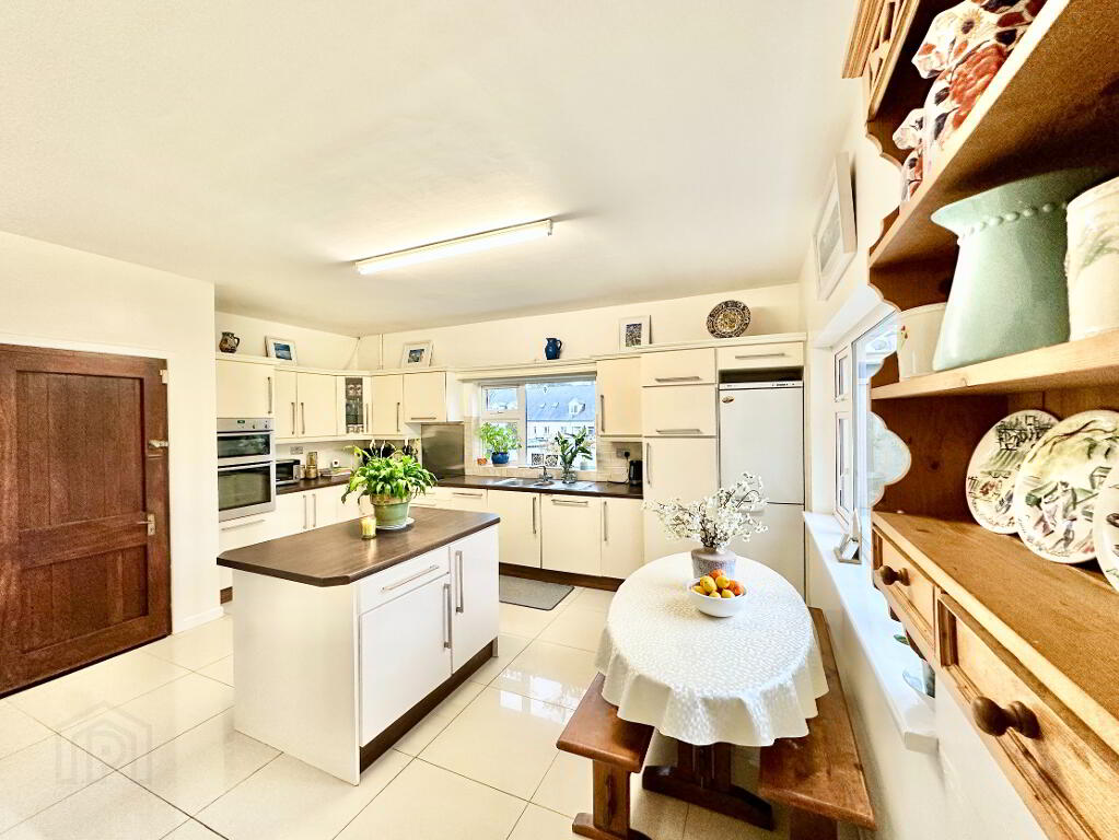 The kitchen/breakfast room is both bright and functional, fitted with high-quality cream cabinetry, a centre island, and Cararra marble floor tiles.