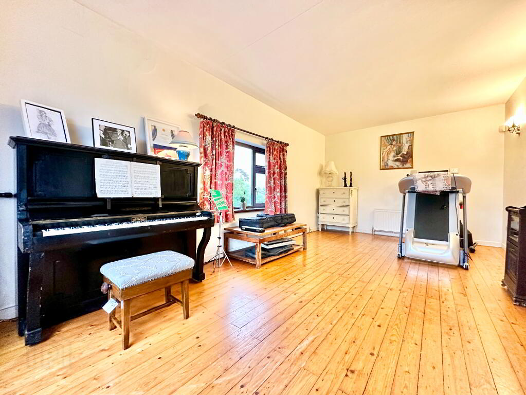 Additional accommodation includes a home office with marble-tiled flooring, a cosy snug/TV room with sliding doors opening to the south-facing garden, patio, and garage, a spacious music/fitness room and a large wet room completing the ground floor.