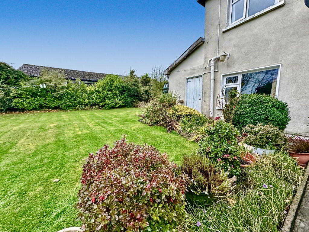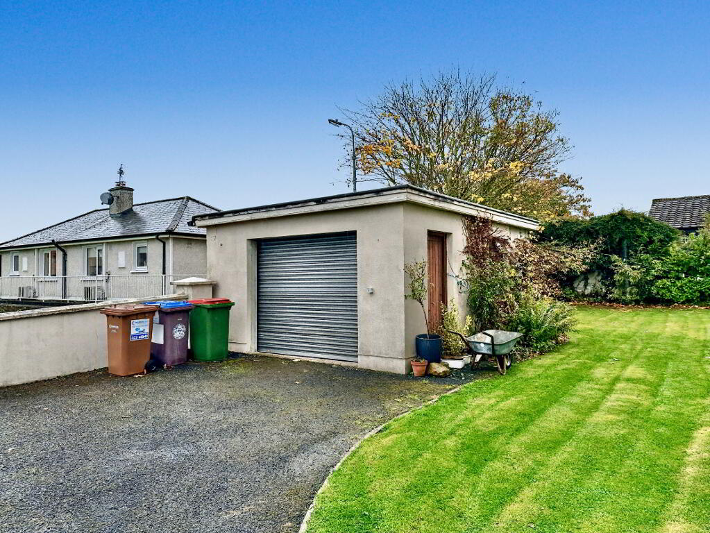 Surrounding the residence is a superb wraparound garden, landscaped with mature trees, shrubs, and colourful planting. A detached garage with an electronic up-and-over door and side access provides additional storage or workshop space.