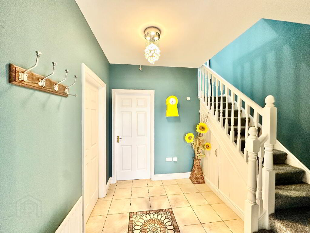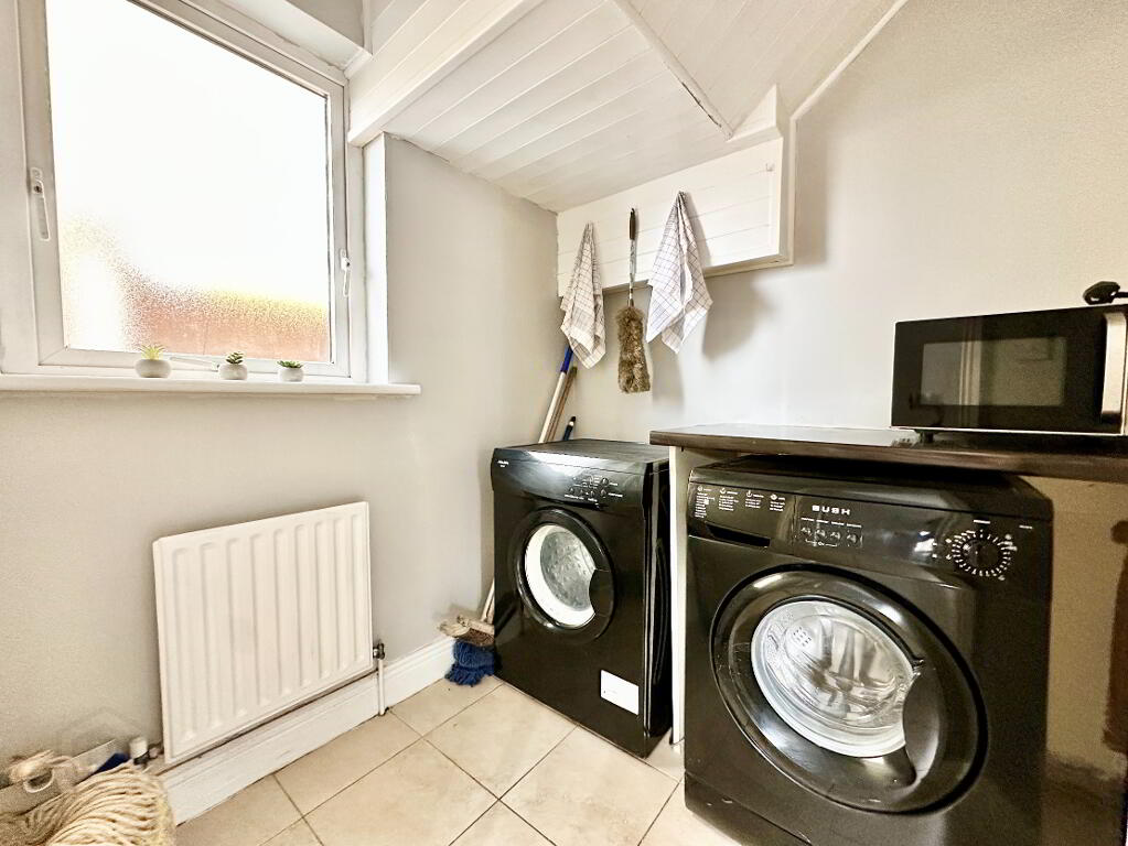 A generous entrance hall sets the tone on arrival, finished with neutral floor tiles and vibrant decorative touches. Clever under-stair storage maximises practicality, while the guest WC showcases a stylish marbled-effect resin finish complemented by a bespoke ceiling feature that elevates the space. The living room exudes a cosy, moody elegance with its washed-effect laminate flooring, large bay window, and Henley stove. Double doors connect this room seamlessly to the bright and airy kitchen, where neutral tiled flooring, cream cabinetry, and an attractive worktop create a welcoming environment for cooking and entertaining. Adjacent to the kitchen is a thoughtfully designed utility room, complete with countertop space and integrated appliances.