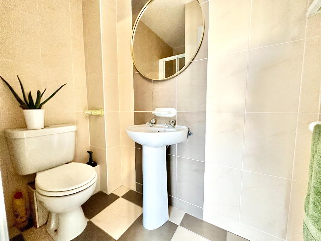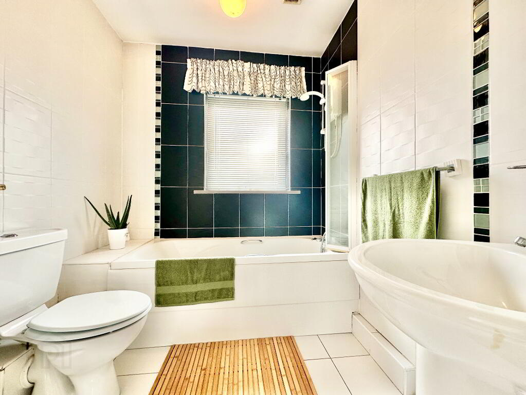 Ascending to the first floor, a spacious landing with attic access introduces four generously proportioned bedrooms, each offering comfort and versatility. The bathroom is tastefully appointed in classic black-and-white tones. The main bedroom provides ample space for fitted furniture and benefits from a private en-suite finished in warm brown and cream hues.