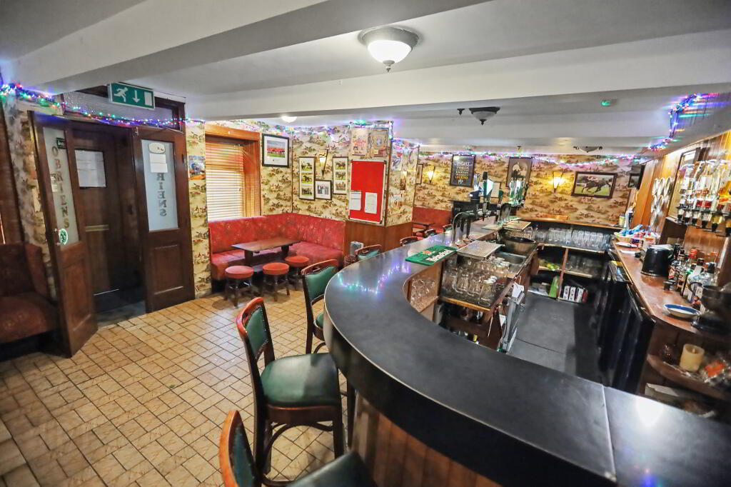 The premises itself presents a superbly appointed traditional Irish public house, immaculately maintained and rich in character. Entry through the handsome front door reveals the principal bar area, a welcoming space adorned with equestrian memorabilia that pays homage to the region's sporting pedigree. Low ceilings, warm wood finishes, and an antique slate open fireplace create an atmosphere of genuine authenticity and comfort—the very essence of a successful Irish pub.