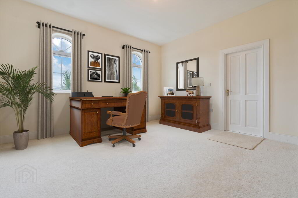 The ground floor accommodation is further enhanced by a guest WC, cloakroom, and a versatile ground floor bedroom, currently in use as a home office, ideal for modern living or remote working.