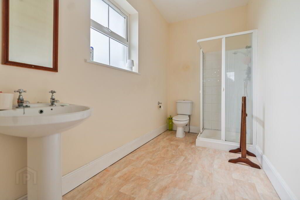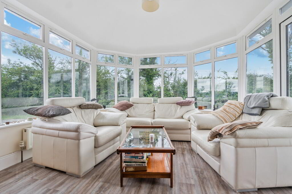 The kitchen/dining room is well-appointed and spacious, fitted with a range of cream country-style built-in units complemented by wood-effect flooring and tiled splashbacks. This superb space flows seamlessly into the adjoining sunroom, where wraparound windows capture exceptional natural light and frame delightful views across the surrounding gardens and countryside.