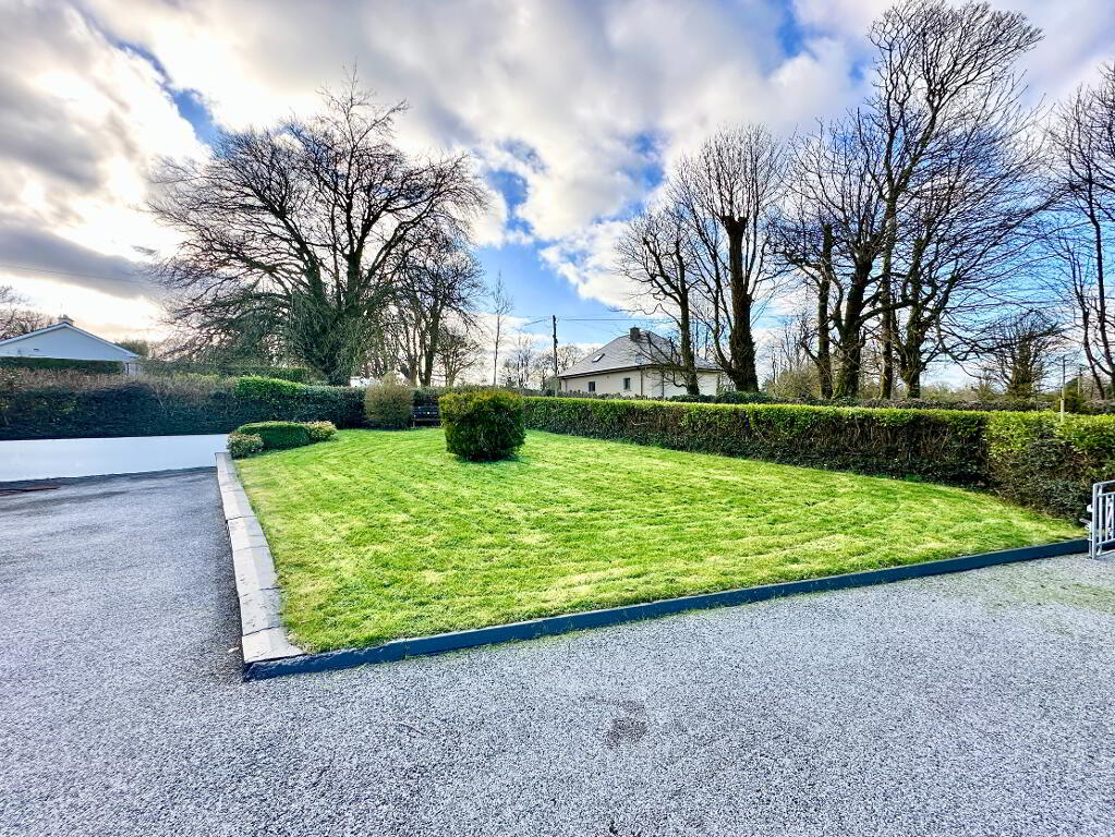 The residence is approached via entrance walls and a sweeping tarmacadam driveway, which provides ample parking and circulation space around the home. The grounds are a particular feature, with well-maintained and landscaped gardens to both front and rear, creating a private and attractive setting. The site is enclosed, affording a strong sense of security and seclusion.