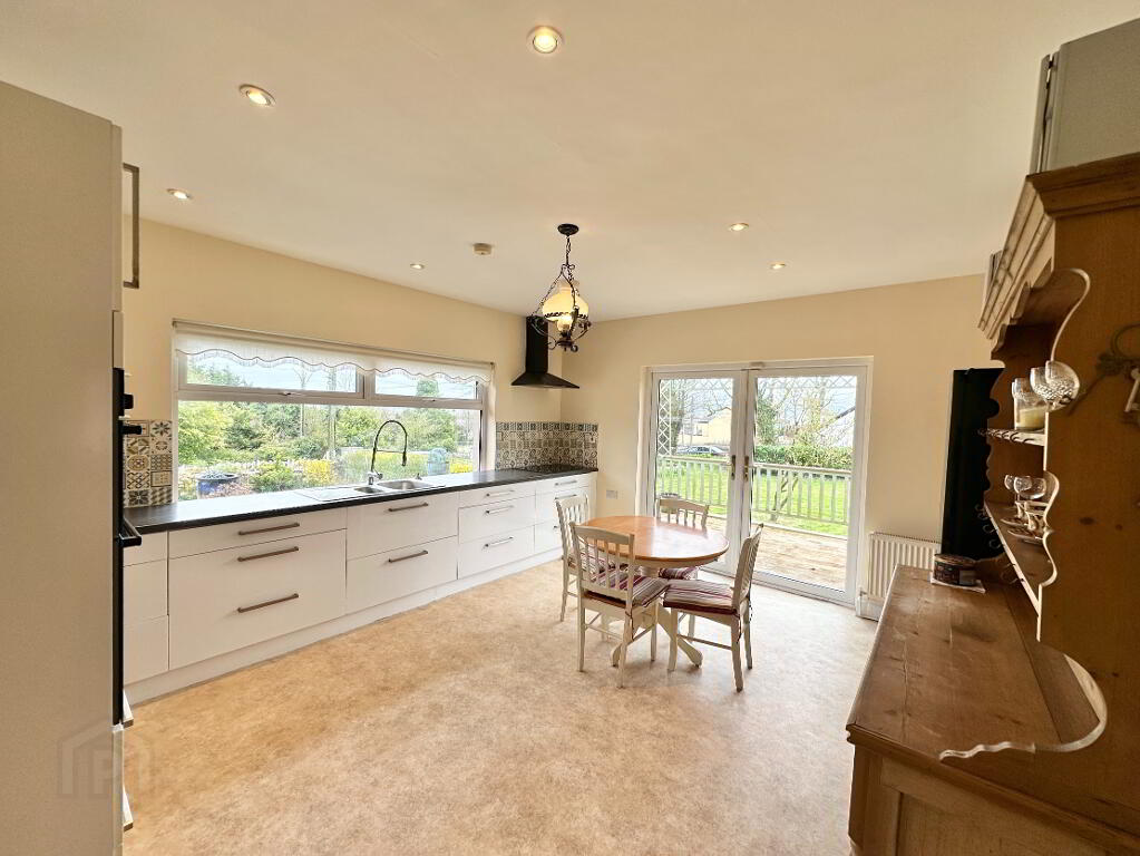 The kitchen is thoughtfully positioned to take full advantage of its dual aspect, enjoying views over the south-facing garden and onwards to the Ballyhoura Mountains. French doors open directly onto a raised terrace, creating an ideal space for outdoor dining and entertaining during the warmer months. The kitchen itself is particularly impressive, featuring elegant white fitted units, ample storage, and an abundance of natural light through large, well-appointed windows and doors.
