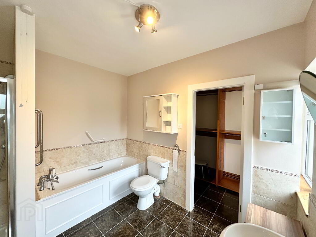 The bedroom accommodation comprises two generously sized bedrooms, each benefiting from en-suite facilities. The principal bedroom is particularly well-appointed, featuring a bath and a walk-in wardrobe. A third room provides excellent flexibility and may be used as an additional bedroom, home office or study, depending on the needs of the incoming purchaser.