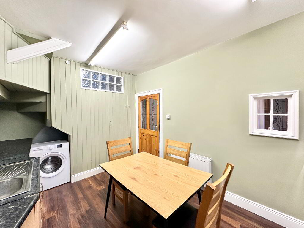 The kitchen and dining area is compact yet practical. Finished with laminate flooring, the room features a range of fitted floor and wall units along with ample worktop space. It is a comfortable and functional space well suited to everyday living and informal dining.